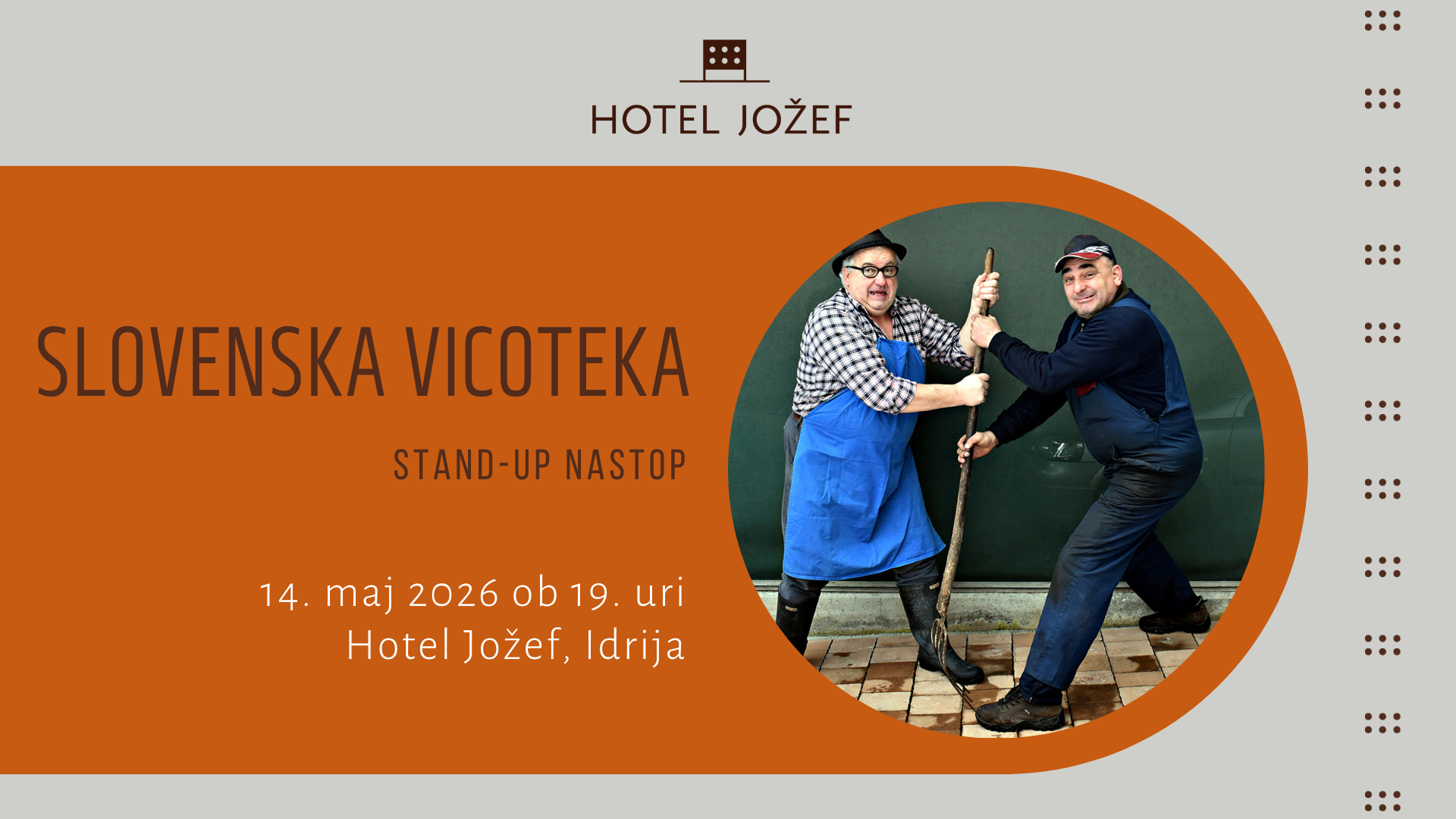 Ste pripravljeni na nekaj zabavnega? ena, gostilna, kmetija. To so trije stebri vsakega slovenskega kmeta. “Kmet Jože” in “kmet Janez” nas bosta nasmejala do solz in čez z zgodbami iz njunega kmečkega življenja in obvezne gostilniške rekreacije.